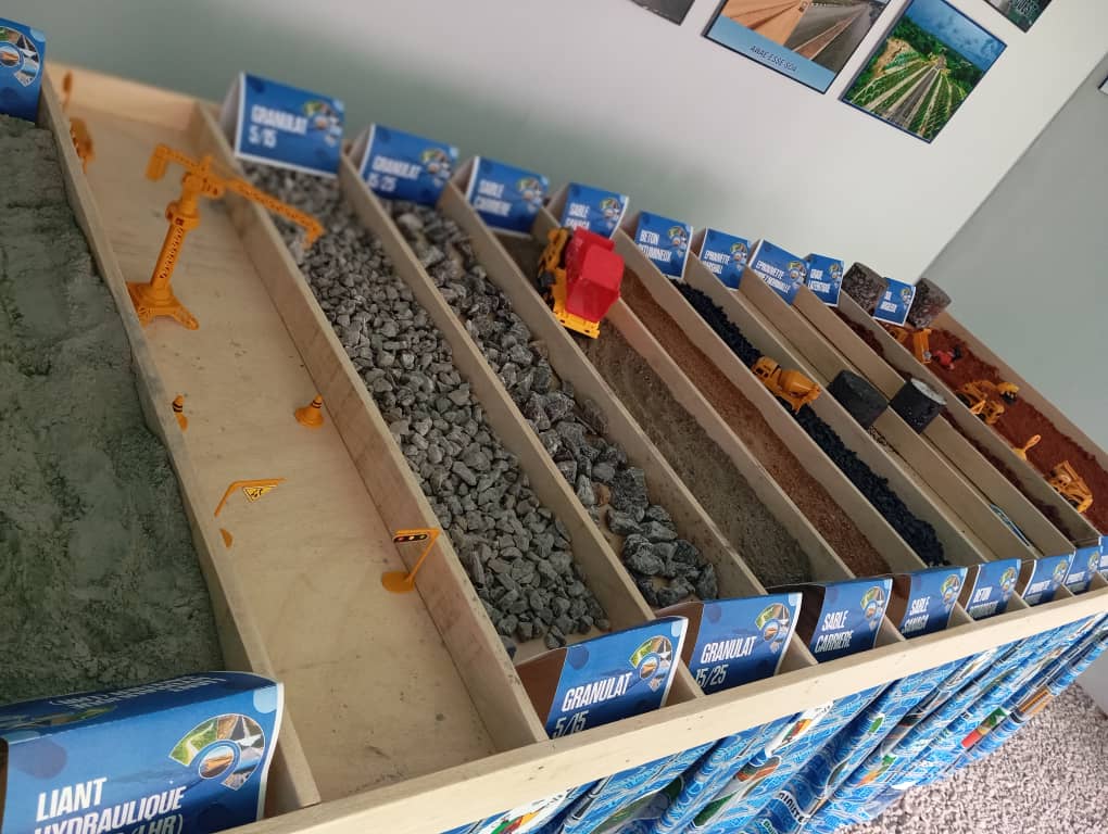 Liant Hydraulique Routier( LHR) en premier plan, exposé par le MINTP à l’occasion du SAGO( Salon de l’Action Gouvernementale ) 2025.